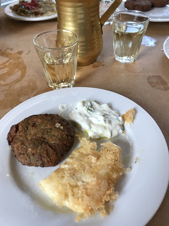 Saganaki, fried cheese, an eggplant pancake and tzatziki and of course, the white wine of the house in a tin pithcer and ordinary milk glass to drink the wine from. It is probably only here that the wine tastes so good in this type of glass.