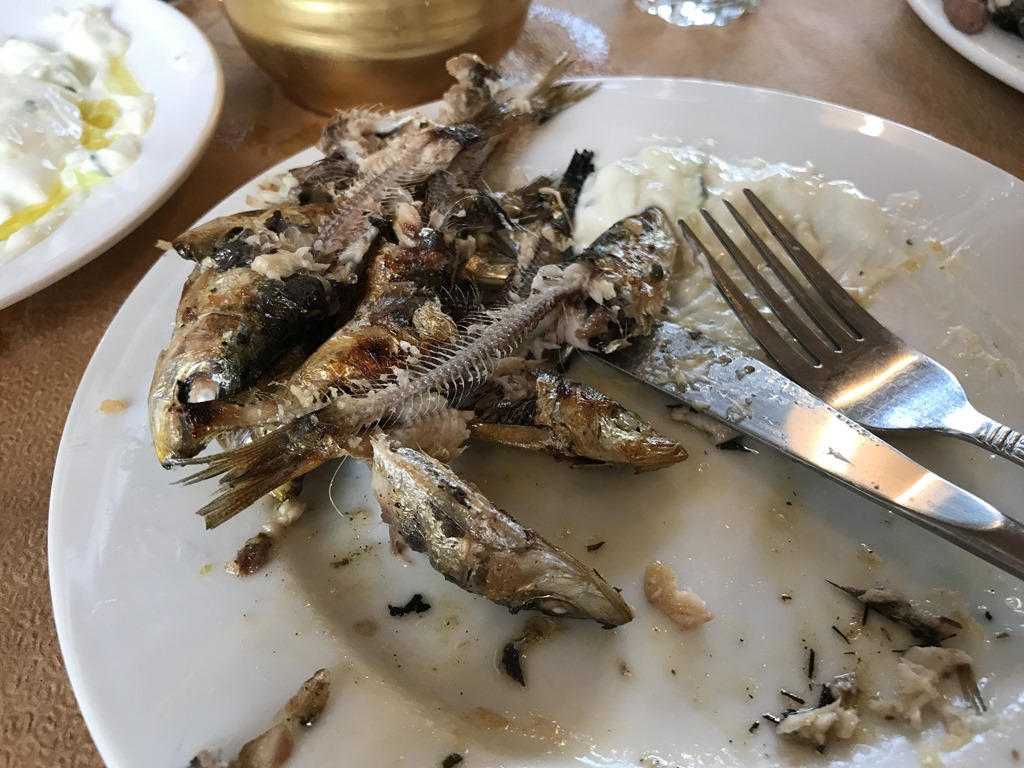 Hann inte riktigt med att fotografera innan för vi var så hungriga. Men de friterade småfiskarna smakade väldigt gott. Lite Tzatziki och gott bröd till.