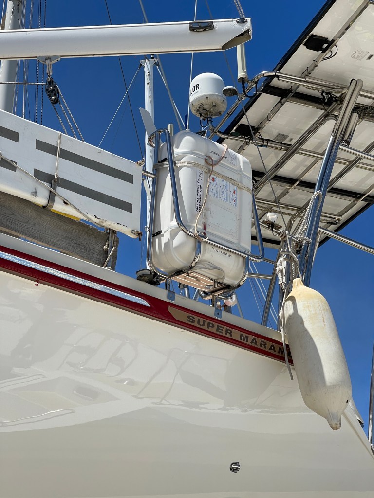 På Super Maramun finns det iofs ett dedicerat fack för livflotten, men den är för tung för att lyfta upp därifrån för en person och då skulle man behöva använda ett fall från mesanen och wincha upp livflotten. Det tyckte vi var alldeles för omständligt och dessutom blev det väldigt mycket kondens i det facket. Så vi har under några år förvarat livflotten på akterdäck, bredvid jollen, men det har inte heller varit optimalt. Därför känns det väldigt skönt att vi äntligen fått till en bra placering.