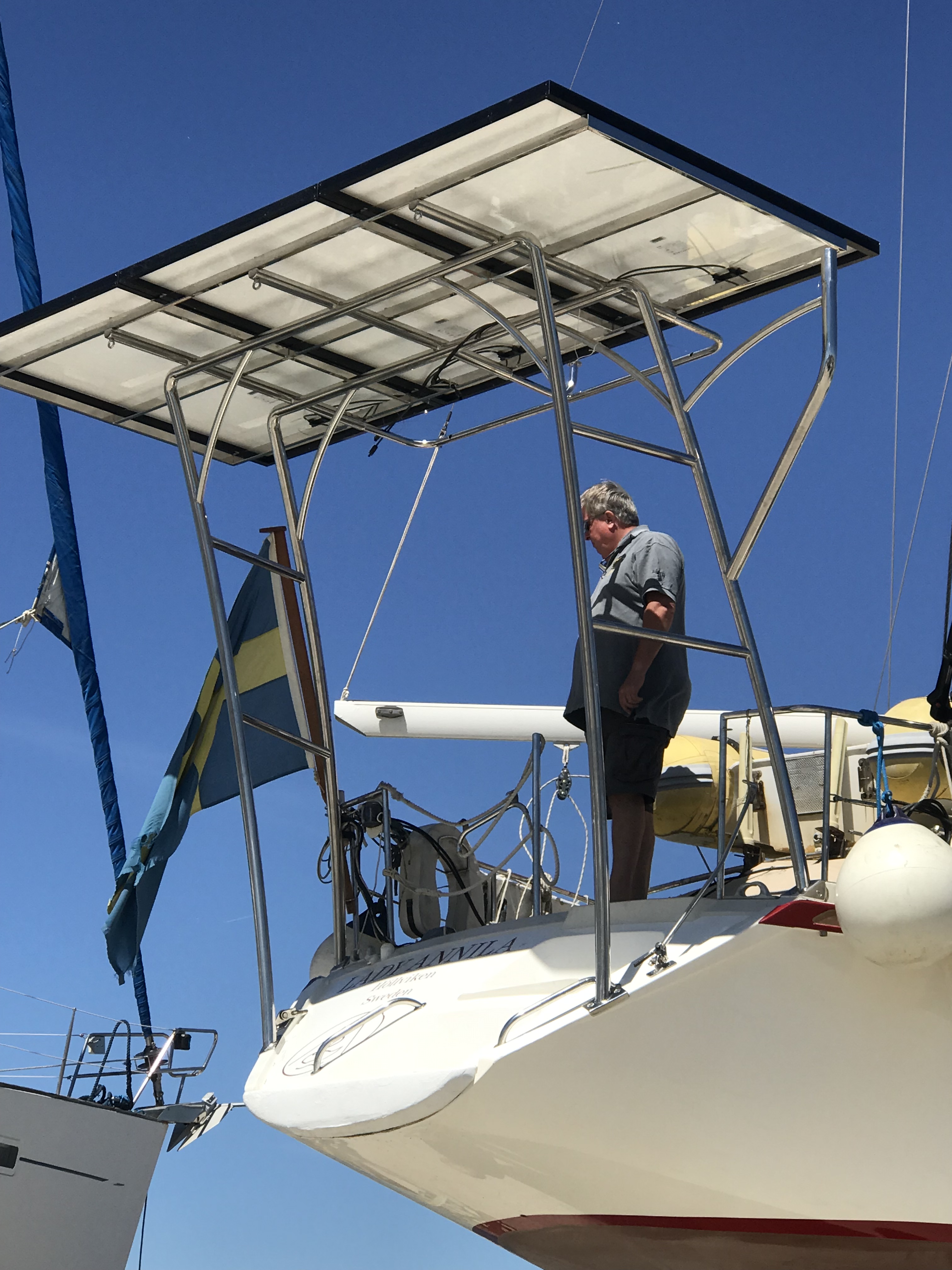 Vi har byggt en båge över aktern med plats för 3 solpaneler, vi har renoverat taket över sittbrunnen och satt dit ytterligare 2 solpaneler, så nu har vi 5 x 367 W vilket ger oss ca 1800W. I samband med detta byttes även invertern till en på 5000W och batteribanken utökades till ca 675Ah på 24v. Nu är vi nästan helt självförsörjande på el och kan köra allt utom tvättmaskinen och aircondition på förnyelsebar energi. Det känns helt rätt.