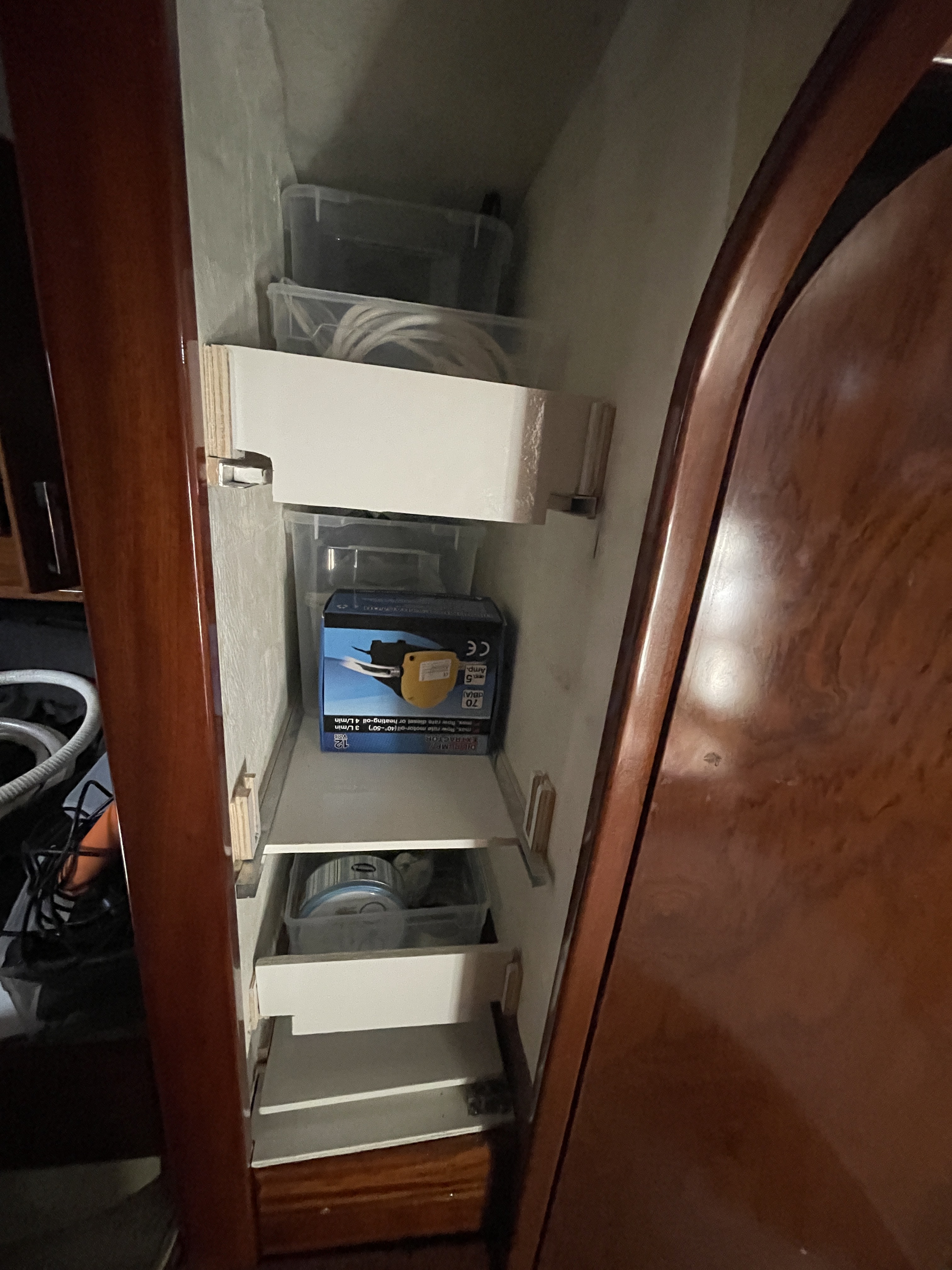Ett projekt som blivit, till 99%, klart är att vi byggt om en liten smal garderob till att rymma två stycken batterier i botten och sedan hyllor ovanför. Det blev riktigt bra. På de utdragbara hyllorna står plastbackar som Jonas kan ha verktyg och reservdelar i.