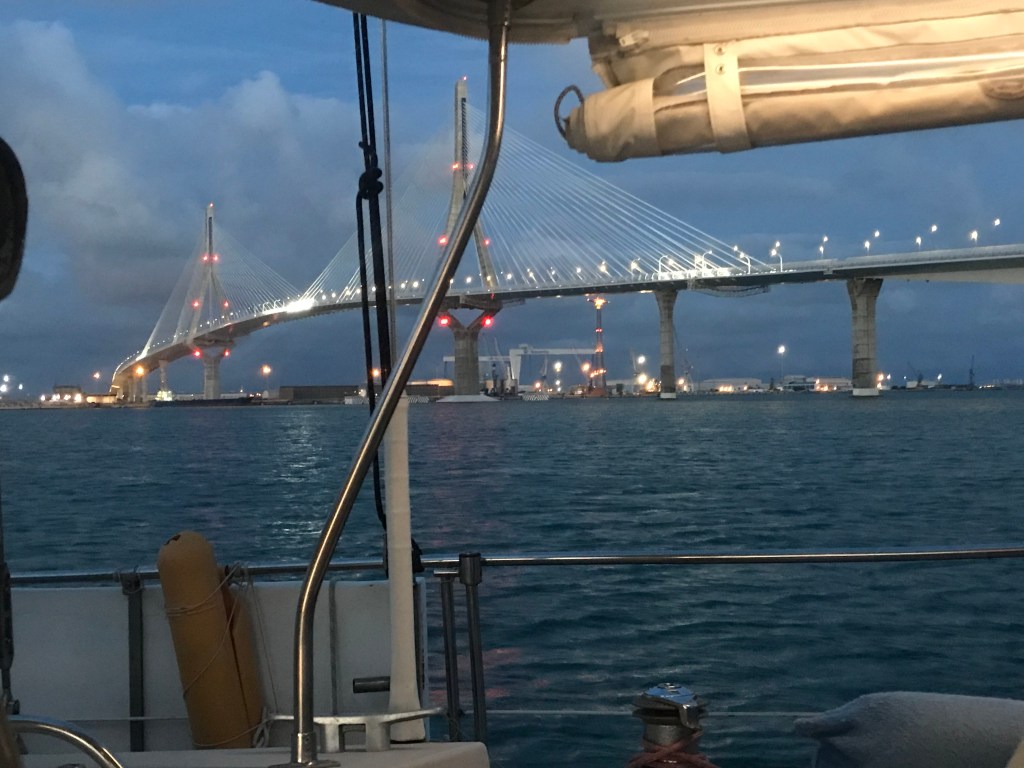 Så kom vi då fram, till Cadiz lägger ankaret strax innan den stora bron och har härligt våg och vindlä från de flesta vindriktningar. Med bron på ena sidan av oss, en industrihamn/storbåts varv på andra sidan och staden framför oss, så räknade jag med att det skulle bli en bullrig ankring. Men här är lungt även ljudmässigt! Inte ens trafiken på bron hör vi. Härligt.