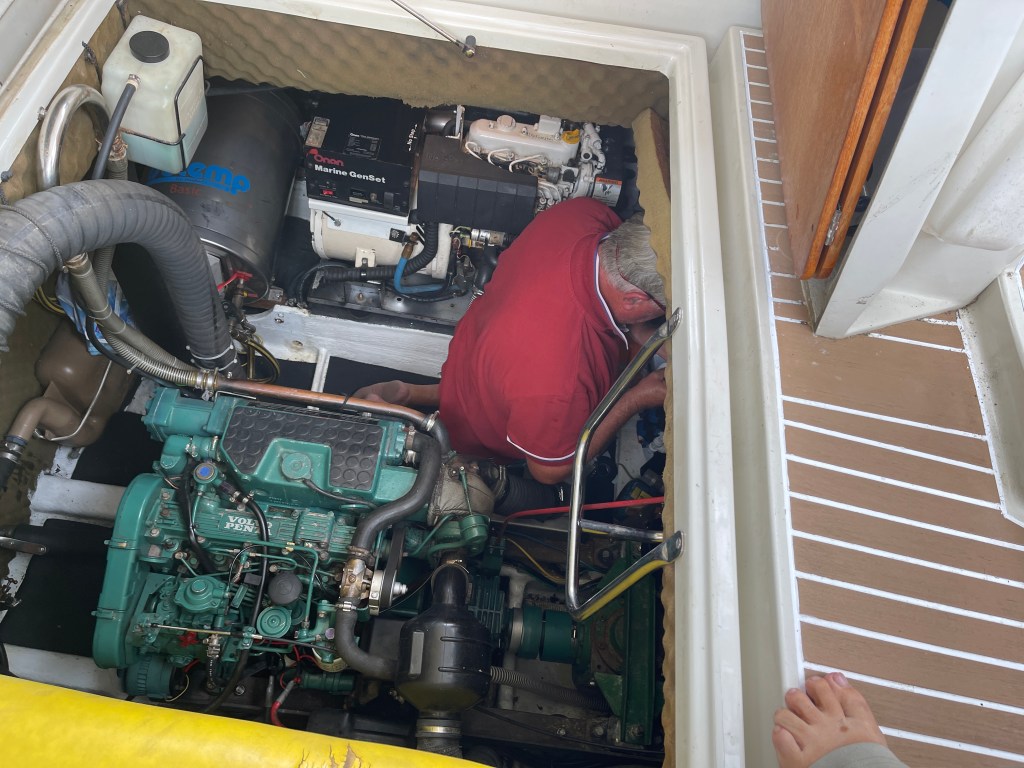 – ”Det löser vi”, säger Jonas och klättrar ner i motorrummet med en rulle tejp anpassad för jobbet, dvs stark och vattentålig och med ett klister som funkar även om det är blött. Jonas tejpade, vi testkörde, stängde av tejpade med testkörde osv. Tejpen funkade alldeles perfekt, men det blev nya sprickor allteftersom Jonas tätade de gamla, så vi gav upp projektet och var glada att vi har ca 800 l i tanken, med sparsamhet så klarar vi oss tills vi hittat en ny slang. Vilket inte borde vara några problem då det är en standardvara.