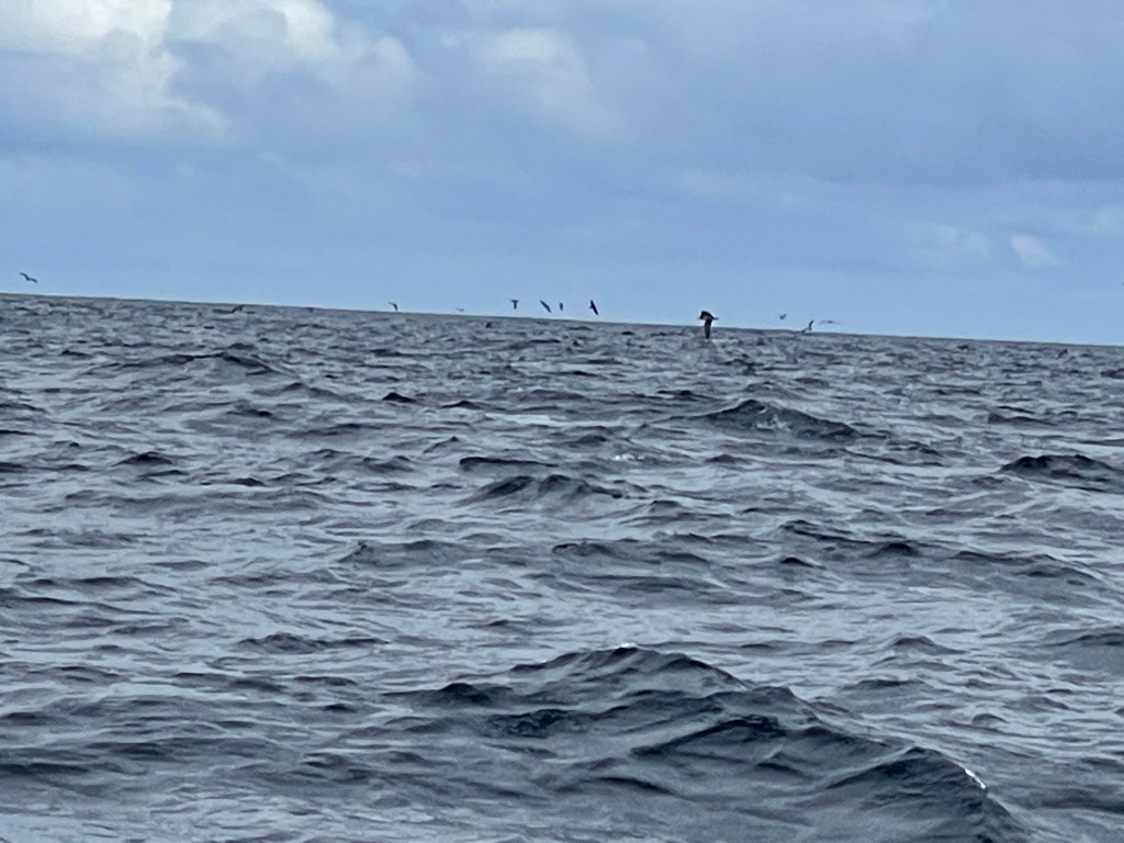 När vi hade gått lite drygt halvvägs och det inte är annat än vatten runt om kring så ser vi plötsligt en mängd sjöfåglar (måsar och andra) som dyker efter fisk och vatten ytan liksom kokar av fisk som hoppar i ytan. Antagligen är det delfiner eller tonfisk som jagar och sjöfåglarna tar tacksamt hand om de stackars fiskar som tror sig klarat sig undan från hotet under vattnet. Men man blir ju lite fundersam, hur vet sjöfåglarna att delfinerna/tonfiskarna jag just nu och just där? OK att en eller två flyger över och upptäcker men hur kommunicerar de med sina polare så att de också kommer dit för ett skrovmål? Så himla långt kan ju inte ett fiskmås skrik höras, eller?