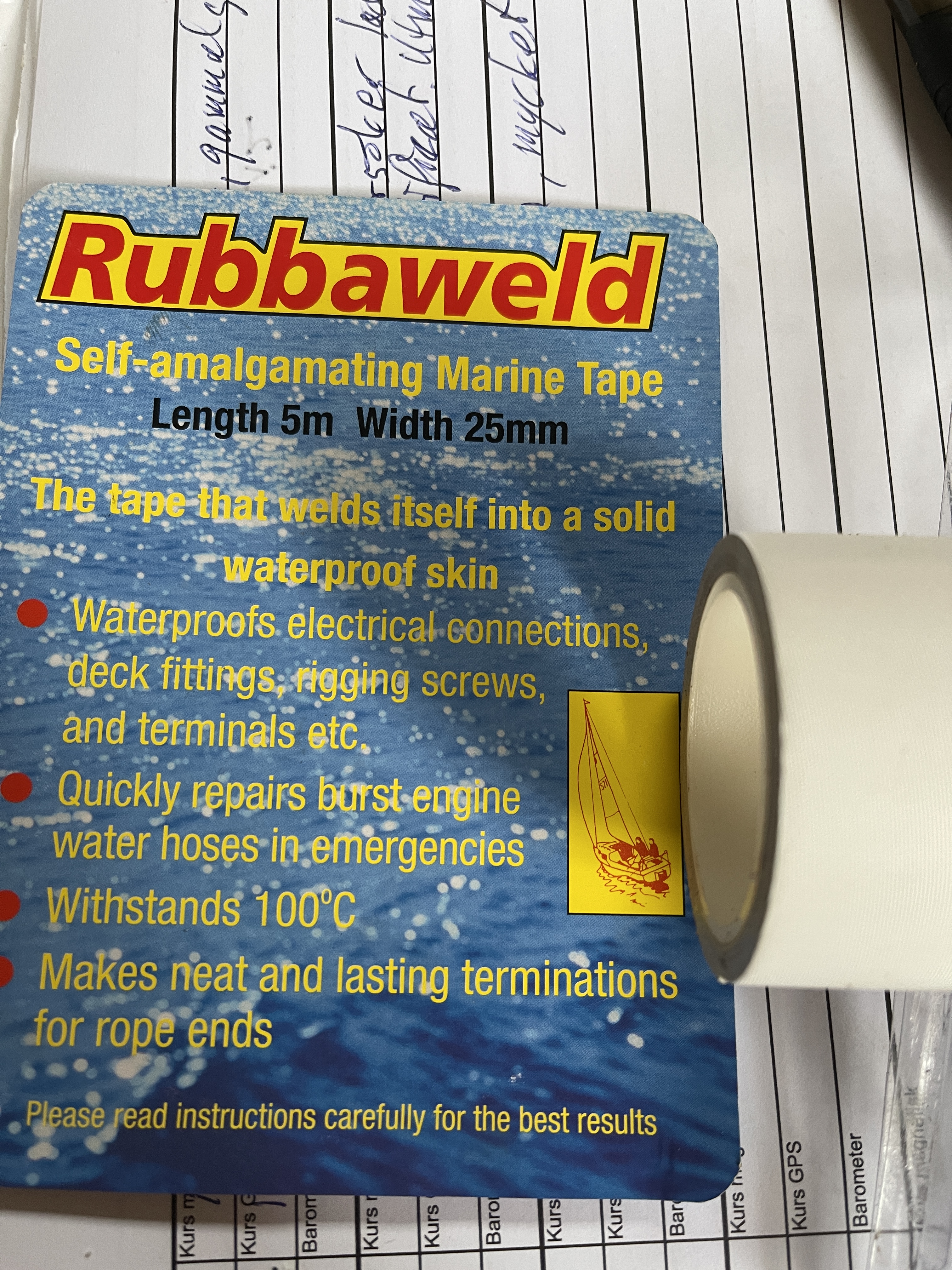 – ”Det löser vi”, säger Jonas och klättrar ner i motorrummet med en rulle tejp anpassad för jobbet, dvs stark och vattentålig och med ett klister som funkar även om det är blött. Jonas tejpade, vi testkörde, stängde av tejpade med testkörde osv. Tejpen funkade alldeles perfekt, men det blev nya sprickor allteftersom Jonas tätade de gamla, så vi gav upp projektet och var glada att vi har ca 800 l i tanken, med sparsamhet så klarar vi oss tills vi hittat en ny slang. Vilket inte borde vara några problem då det är en standardvara.