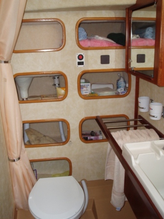 Främre toaletten med stuvutrymmen bakom toaletten. Anledningen till att det är öppna fack är att luft skall kunna cirkulera för att minska risken för mögel när man är på varmare breddgrader. Här finns även