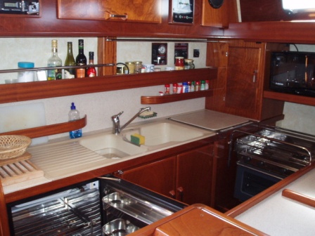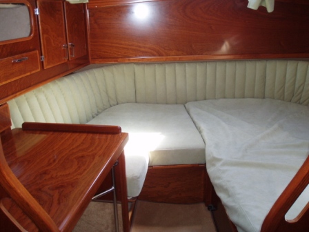 Förkabinen, med gott om skåp att stuva i. Den vänstra kojen kan man utöka till en dubbelkoj och har på så sätt 3 kojplatser. Förkabinen är ett vattentätt utrymme. Innanför skåpen rakt fram är ett vattentättskott till ankarbox och segelstuv som man kommer åt från utsidan. Förkabinens dörr kan förseglas så att ev vatten inte kommer längre än till detta utrymme