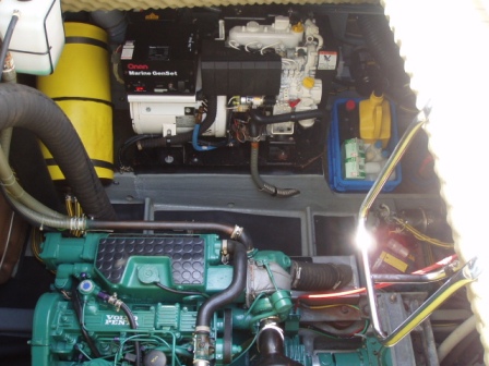 Här är motorrummet. Där samsas vår motor med dieselgenerator och varmvattenberedare, watermaker och annat elektriskt. Även detta utrymmet är vattentätt. Enda ingången till motorrummet är från sittbrunnen.